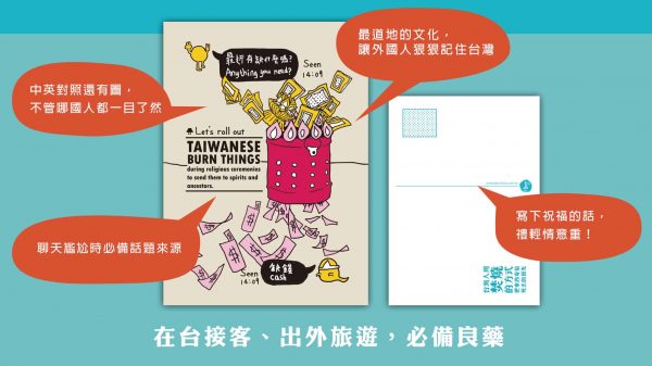 Project Description 台灣人的生活之道:台灣文化明信片 NT $ 300 你都如何跟外國朋友介紹台灣?除了知名景點外,有趣的文化更能開啟話題!18張台灣道地文化明信片,讓旅人輕鬆和新朋友介紹台灣。 —商品資訊— 商品材質|紙 商品規格|明信片大小,內含18張 運送方式|宅配(運費50元) 物流時間|2-3天(不包括例假日) 商品提問立即購買 商品介紹旅行時想要好好介紹台灣文化嗎? 除了101、中正紀念堂、日月潭,還可以聊些什麼? 滾出趣設計了18張台灣人生活之道明信片,提供你最好的文化交流道具, 可以隨意抽一張,也可以一張一張慢慢介紹。 正面是文化現象,背面是空白明信片,可以寫下祝福的話,送給外國朋友。 共18張明信片,18種不同文化主題,從飲食到宗教到政治,各種面向讓世界更了解台灣! 明信片款式 立即購買 相關專案 找找藏在城裡的南洋生活 26 7 月, 2021 滾出趣旅行任務手札 6 6 月, 2018 新島嶼故事捕手計畫 21 1 月, 2018 石碇彩石趣親子活動 19 11 月, 2016