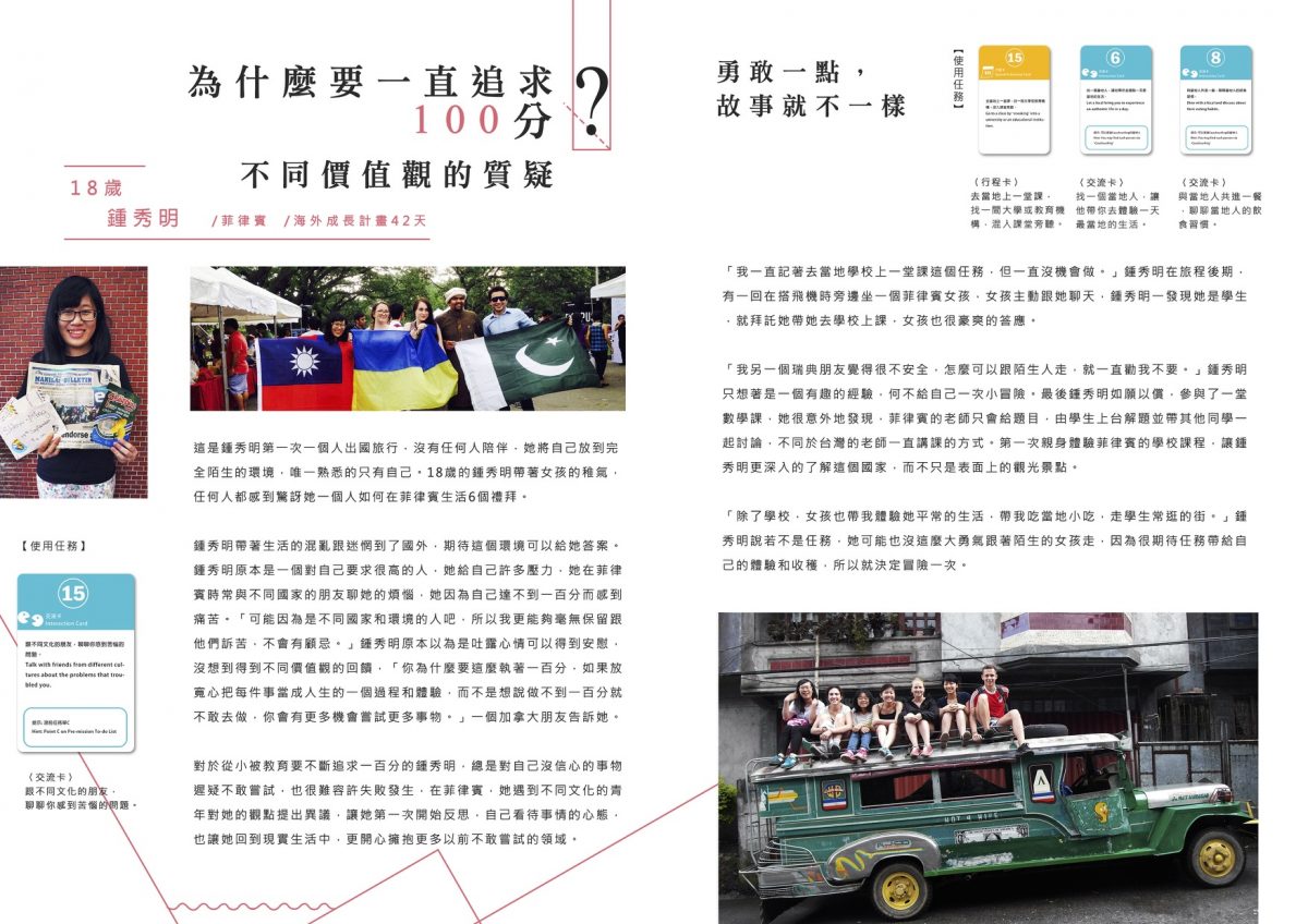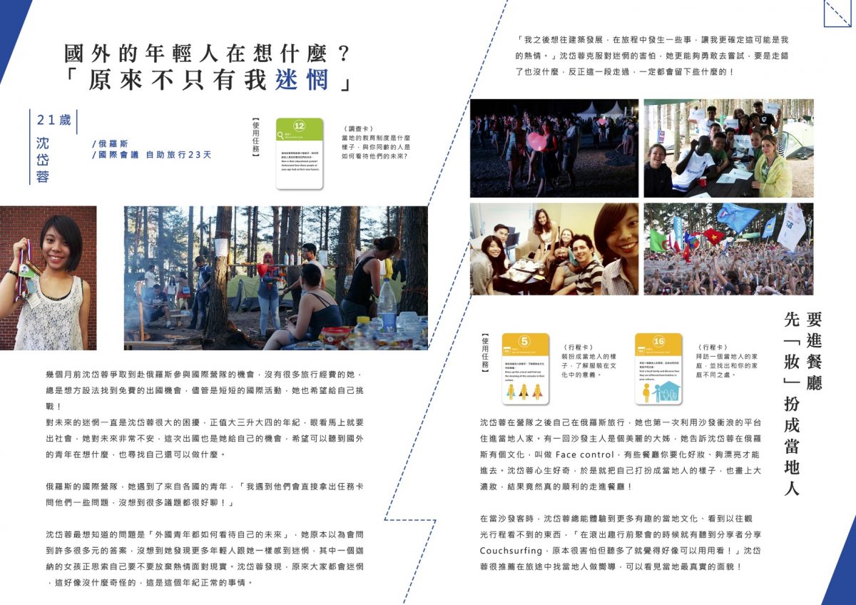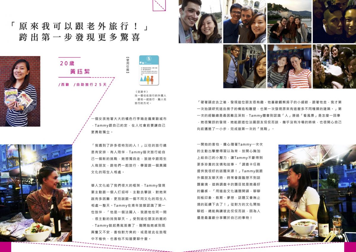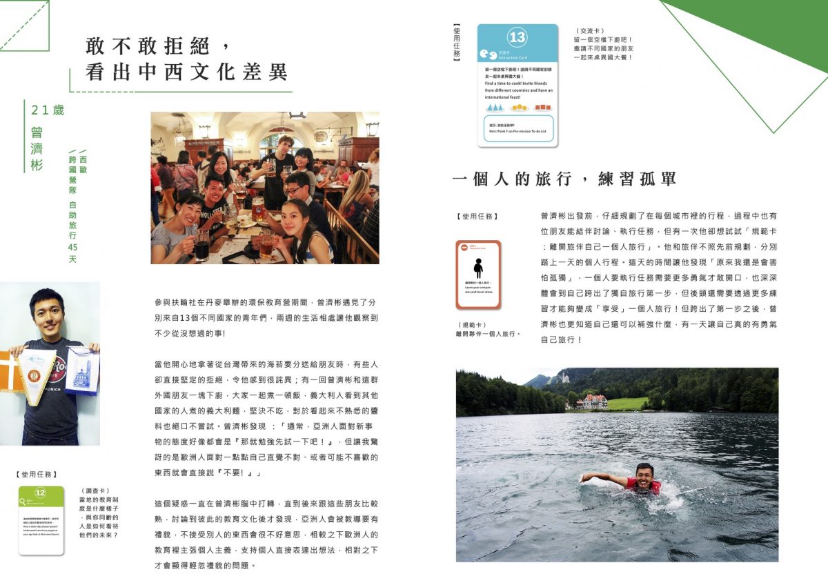 每個滾大使會拿到一包旅行任務卡,在行前會也會一起討論自創任務,在旅行過程中我們也會在社團裡隨機出任務給滾大使。