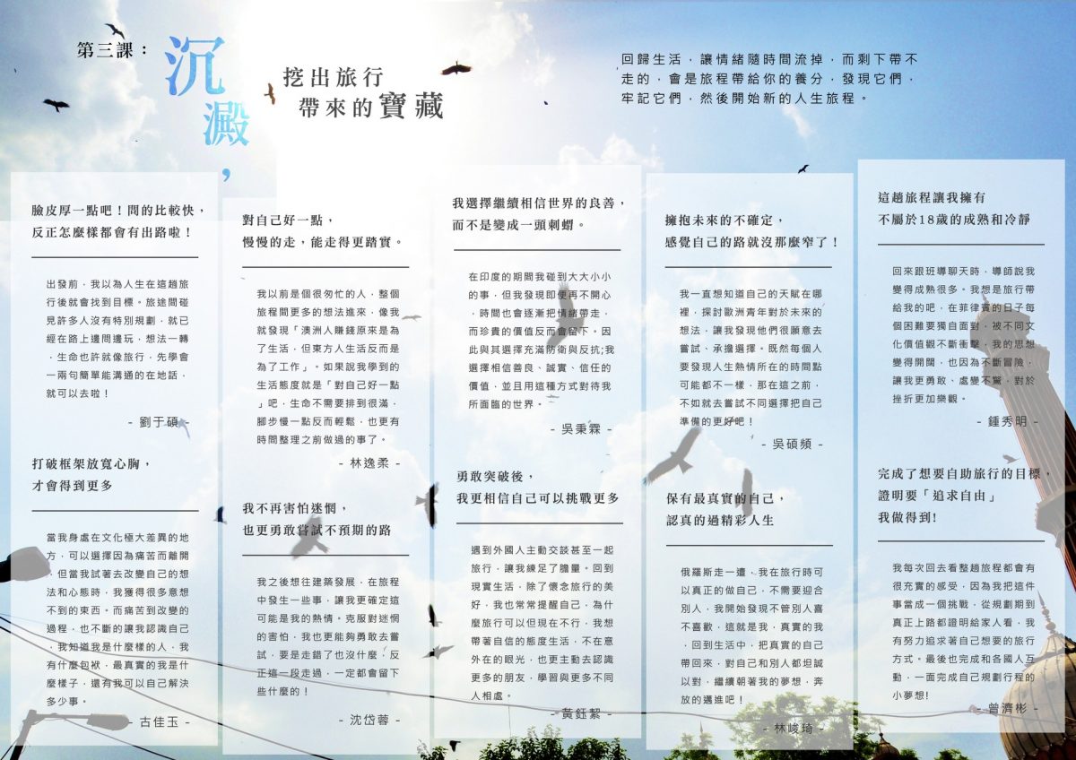 回到台灣,大使們坐在一起沈澱旅行的收穫,拿出旅行中帶回來的東西與彼此分享,這一場活動,回到每個旅人自己,好好的看見旅程後蛻變的自己。