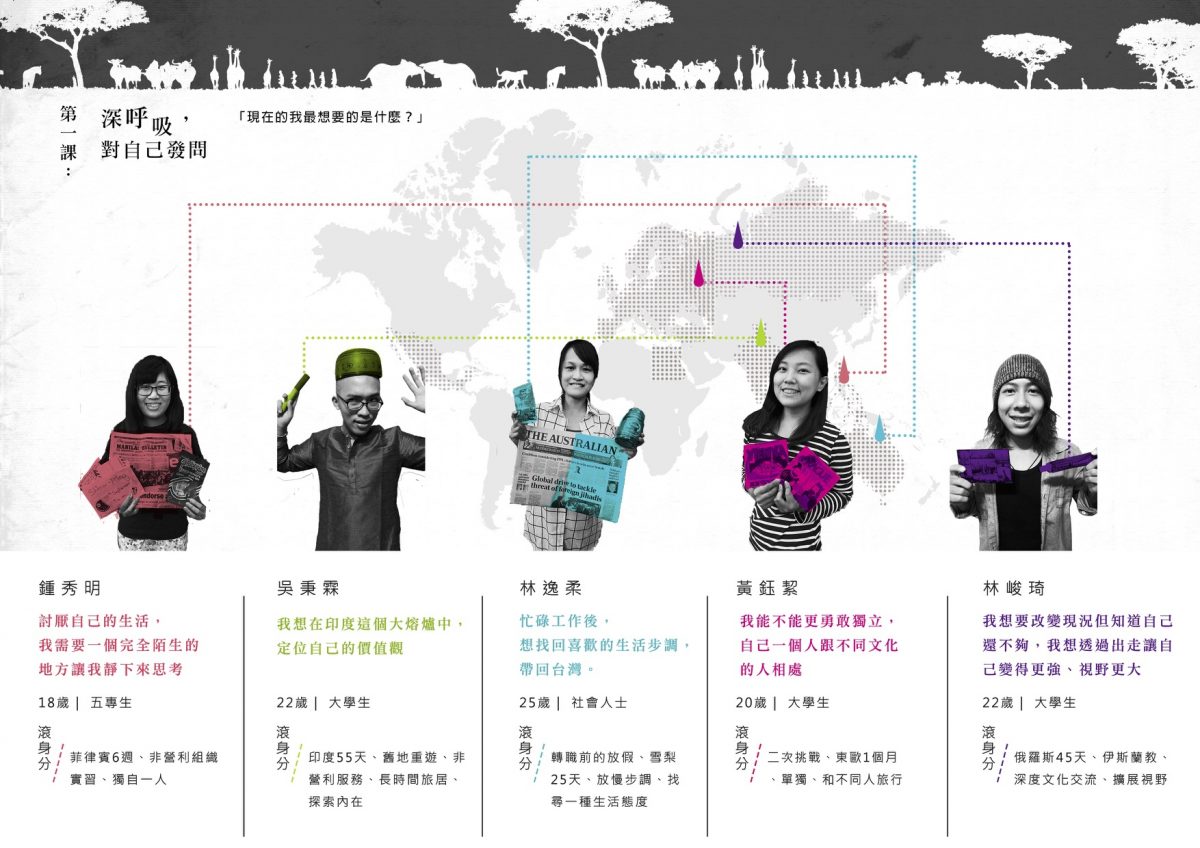 一天的時間,首先讓滾大使在街頭練習冒險任務,接著大家分享自己的旅行計畫,討論如何在旅程中執行任務。也邀請旅行經驗者來分享自己在旅行中如何創造特別的故事!